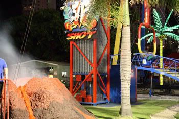 Най-популярен е “вулкана”. Двама ги закопчават на една седалка, която първо потъва в една дупка, там започва да присвятка, излиза пушек и седалката се изстрелва нагоре с невероятна скорост. При първата амплитуда подминават дори нивото на нашия балкон. Това трябва да е повече от 80 метра. Дълго се чудя какви са тези невероятни ластици. При по-близка инспекция установявам, че ластици няма – седалката се крепи на две стоманени въжета, които изчезват в грамаден метален бокс пълен със 144 яки пружини (12×12), които се сгъват и разгъват заедно с тях.