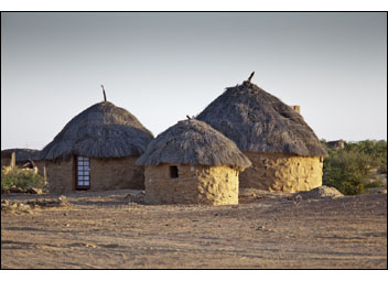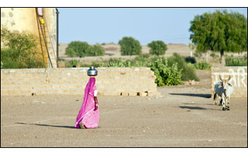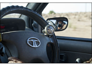 Пред хотела се довлачва една ръбата кола, която с изтърбушените си седалки и прозорци дето не се свалят, много ми прилича на лада. Ако някога е имало климатик, той отдавна не работи. За миг съм изкушен да се откажа. В тази непоносима обедна жега би било по-приятно да надигам тънък чай в някое сенчесто кафене. Приключенския дух у Веско обаче надделява и се пъхам в нажежената кола да видя какво ми е приготвила натам индийската карма. Кармата решила, че първо трябва да се опека едно хубаво, понеже докато шофираме към пустинята слънцето жюли от моята страна. Аз съм безпомощен в тясната кабина, не мога да си разпъна чадъра и само въртя глава като гущер. После, когато спираме да видим „традиционното село“ , съм малко объркан, понеже наоколо има само няколко сиви сгради, подобни на тези в Джейсалмер. Поглеждам моя шофьор с въпрос, а той сочи към едно място, заградено с висока бетонна стена, дето много ми прилича на склад за строителни материали. Той прави знак да влизам там и бързо се прибира в колата си.