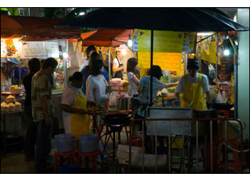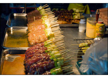 Има обаче и количка с газови горелки и някакъв чичка дето се набира да върти три тигана (woks), в единя се готви, втория се мие, а третия е готов за готвене. Чичката е чевръст, мята в нажежения вок някакви продукти в зависимост от това какво са му поръчали, разбърква ги малко, слага сосове и хоп – готово, още едно ядене за някой. Аз съм свит, не знам какво да кажа на чичката, само зяпам и преглъщам лакомо. Добре че натам виждам някакви шишчета дето ги пекат на жар. По-лесно е да си поискам четири пилешки, четири свински и четири телешки, като соча и показвам бройката с пръсти. Всяко шишче струва само 10 бата. Така вечерята ми излиза по-малко от $4AUD. Започвам да гледам благосклонно на Тайланд. В основата си шишчетата имат парче люта чушка и парче ананас да убие лютото. Баси молко са вкусни и адски вървят с четирите бирички Singha, които си купувам от 7/11 до хотела. След тях съм готов за велики дела… утре.