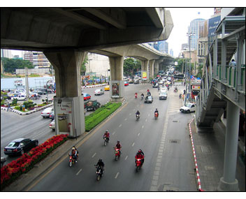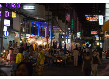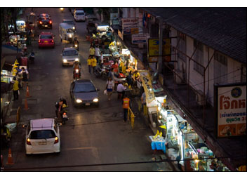 Мръсните сгради наоколо са с олющена мазилка, а по разбитите тротоари е пълно със сергии сглобени от подръчни материали. Кипи бизнес: обувки, дрехи, туристически буклуци, народ и казани с кипящи течности. Заоблени лелки бъркат с черпаци в тях и вадят бульон да го излеят в найлонови торбички. Просяците просят, мършавите кучета скимтят в очакване някой да им хвърли нещо. Живота тук ври и кипи, а моите инстинкти за действие се завръщат. Гледам къде сме, гледам картата и осъзнавам, че над нас е Sky train. Зарязвам автобуса да се влачи без мен в следващите два часа, викам на оня да отвори вратата, той ме гледа тъжно че съм се отървал, после за 30 бата се мятам на влака горе. След десет минути съм в хотел Рено.
