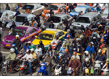 Вече навлизаме в града и става по-интересно. Трафика се сгъстява и става лудница. Всякакъв транспорт превозва всякакъв вид товари: джипки с кашони или бали трева, вързани на два, три метра височина, многобройни малки моторетки с по един кльощав отпред, кльощава жена отзад и няколко кльощави деца по средата, камиони с прасета на два етажа, разни очукани автобуси, натъпкани до последно, пикапчета с плоска карусерия, по която са насядали двадесетина тайландци, някои от които висят ухилени отзад. Всеки се юрка на някъде със завидна енергия и оптимизъм.