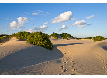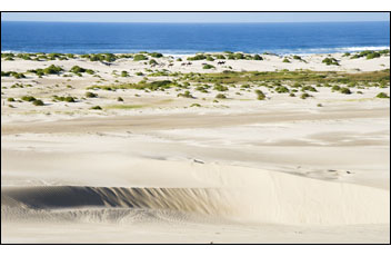 Край дюните съм рано сутринта. В туристическата карта пише, че можеш да излезеш на брега с колата. Това ми се струва чудесна идея и след кратко лутане откривам входа към резервата в северния му край, близо до малко селце наречено Anna Bay. Още с първите метри обаче затъвам в пясъка. Налага се да спра на малко тревно островче и да продължа пеш. Стотина метра по-късно попадам в един напълно различен свят. Слънцето вече изгрява и странните пясъчни бабуни сред които вървя хвърлят дълги, чудати сенки. Меката утринна светлина багри всичко в розово. Тогава излизам на открито и пред мен се ширват невероятните пясъчни хълмове. Зад тях виждам други, още по- високи до където поглед стига, сякаш нямат край.