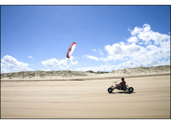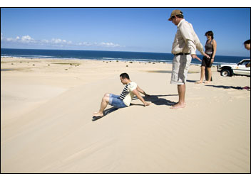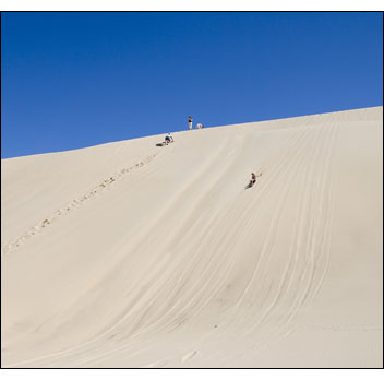 Малко след това ни чакат нови емоции – сандбординг. Andrew вади няколко дъски, подобни на сноубордове и ги маже с парафин за по-висока скорост. Сядаш на дъската, подпираш краката отпред и балансираш с ръце в пясъка. После летиш надолу. Невероятно усещане! Едиствения проблем е че няма някакъв лифт да те вдигне обратно. След няколко спускания, уморени от катеренето и щастливи от пързалката, се товарим в колата и отново поемаме през дюните.