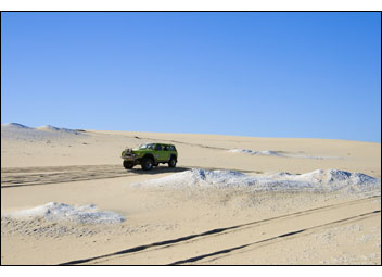Докато ни говори, той оглежда внимателно дюните пред нас. Избира най-високата и се устремява към нея. Тойотата скача, занася се и оре нагоре без да спира. Вече на върха можем да се възхитим на невероятните пространства разкриващи се във всички посоки. Тук сме близо до гората и виждаме как пясъците бавно, с около 4 метра годишно я поглъщат. Andrew ни покава следите оставени от различни животни и ни учи как да различаваме динго от куче, кенгуро или гущер. После отново се качваме в колата, нашия водач ни съветва да стегнем коланите и ни засилва към най-стръмната част на хълма. Всички пищят от ужас и възторг, но тежката кола не се премята, а се свлича меко в почти вертикалния пясък.