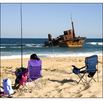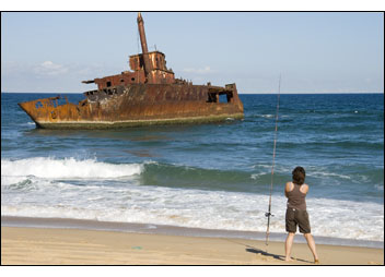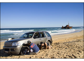 След тенекиеното градче, отново шофираме по брега, докато стигнем до “Sygna”, норвежки товарен кораб, заседнал в прибоя през 1974 година. Останала e само малка част от кърмата и командния мостик, но ръждясала и стърчаща в синята вода, отломката продължава да бъде впечатлителена. Това е крайната точка на нашия тур. Преди да тръгнем обратно ставаме свидетели на друго едно засядане – този път не на кораб, а на 4WD, шофиран от неопитен водач, който успява с много газ да се зарови до дъно в пясъка. Andrew го съветва да спусне малко гумите и после всички му помагаме да се измъкне.