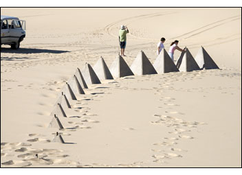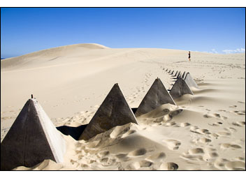 Докато шофираме, тук там забелязваме странни симетрично ръждясали стълбчета в пясъка. Andrew обяснява, че това са остатъци от отбранителните съоръжения изградени през Втората световна война. Тогава австралийците са се страхували от японско нападение¹. За щастие единствената атака на японците била от подводница, обстрелвала без особен успех New Castle, стратегическо пристанище на около 20 километра от тук. В пясъците откриваме също и няколко от “изгубените” 30 000 бетонни пирамиди предназначени да забавят евентуално танково нападение. “Изгубени”, тъй като от постоянното движение на пясъка пирамидите изчезват или се появяват в различни точки.
